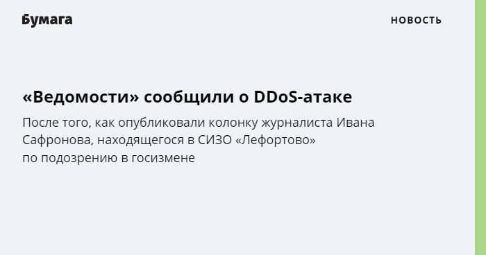 Днем 23 июля «Ведомости» сообщили о DDoS-атаке, которая произошла после публикации на сайте колонки журналиста Ивана Сафронова. Сейчас мужчина находится в СИЗО «Лефортово» по подозрению в госизмене.