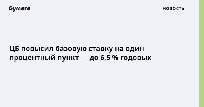 Банк России на заседании 23 июля повысил ключевую ставку сразу на один процентный пункт — с 5,5 % до 6,5 % годовых. Об этом сообщается на сайте организации.