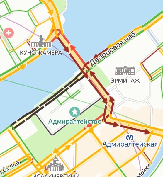 Перекрытия отражены и на «Яндекс.Картах». Движение ограничено по набережной вдоль Адмиралтейства, дороги рядом со зданием тоже перекрыты. Движение по Дворцовому мосту и Дворцовому проезду сильно затруднено.