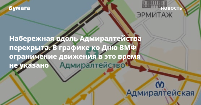 При этом в графике ограничений ко Дню ВМФ, опубликованном комитетом по транспорту, перекрытий в это время нет. По графику Адмиралтейскую набережную перекрывали 22 июля с 9:00 до 14:00 и должны перекрыть повторно с 21:00 24 июля до 14:00 25 июля. С 0:00 23 июля до 14:00 25 июля на Адмиралтейской набережной запрещено парковать транспорт.