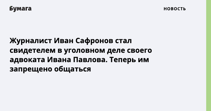 Бывший журналист «Коммерсанта» и «Ведомостей», а также советник главы «Роскосмоса» Иван Сафронов, обвиняемый в госизмене, стал свидетелем по делу своего адвоката Ивана Павлова. Теперь Павлов и Сафронов не могут общаться, сообщается в телеграм-канале Павлова.