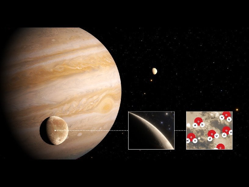 На поверхности Ганимеда имеется значительное количество водяного льда. Хотя лед находится при температуре до –185 градусов по Цельсию, потока заряженных частиц от Солнца оказывается достаточно, чтобы часть льда превращалась в водяной пар. Лоренц Рот (Lorenz Roth) из Королевского технологического института в Стокгольме и его коллеги провели комбинированный анализ новых спектров, полученных в 2018 году с помощью установленного на телескопе «Хаббл» ультрафиолетового спектрографа (COS), и архивных изображений, полученных «Хабблом» при помощи оптического спектрометра STIS в 1998 и 2010 годах.