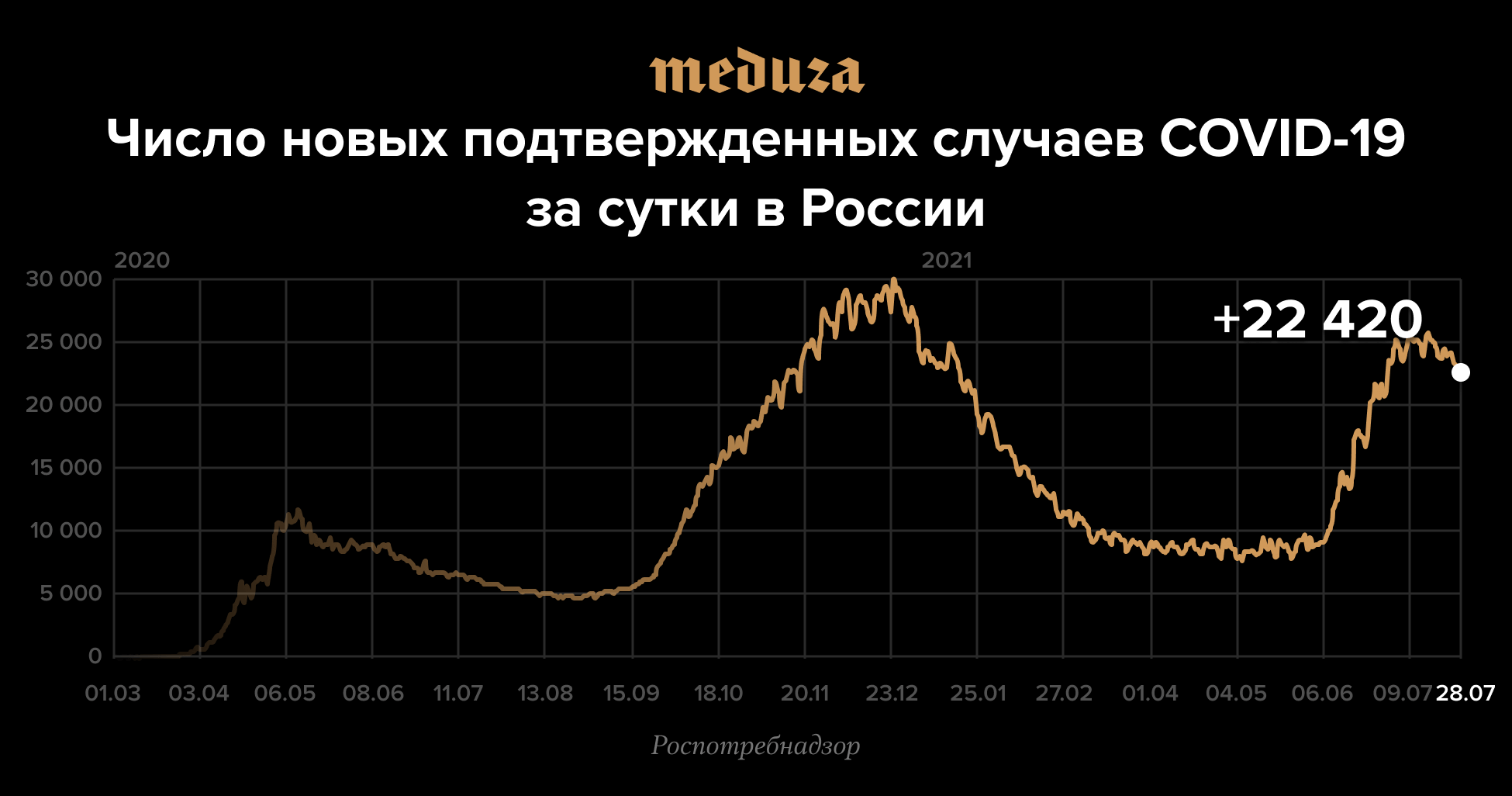 - По официальным данным, в России за сутки заболели 22 420 человек. Впервые с 30 июня выявили меньше 23 тысяч новых случаев заражения.