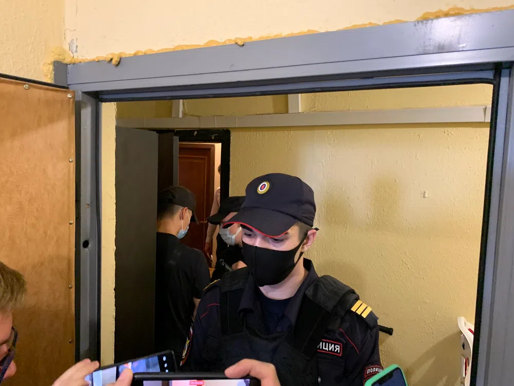 «Закон о СМИ разрешает нам наблюдать за дверью квартиры. Не имеете права ее скрывать», — кричит кто-то из толпы. Полицейские, переглянувшись, решают дверь не закрывать. Один из них встает в проеме, не давая пройти.