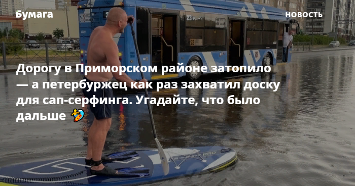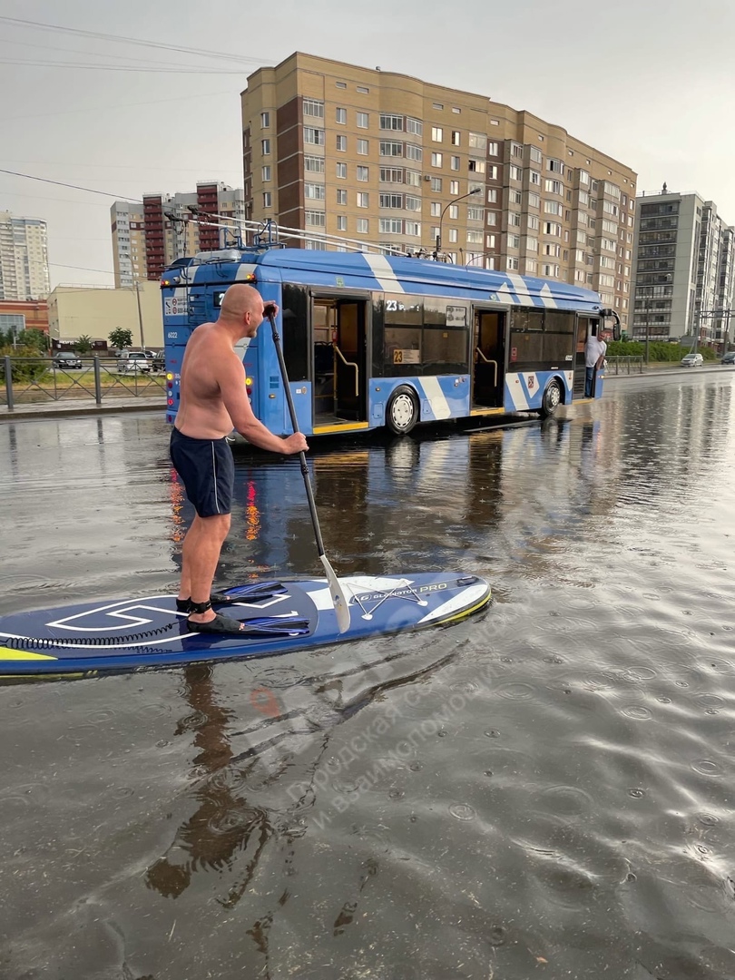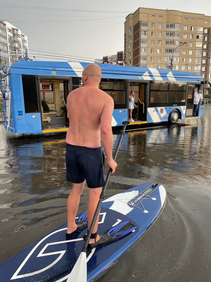 Петербуржец воспользовался потопом, возникшим вечером 28 июля из-за непогоды, и стал участником дорожного движения на доске для сап-серфинга. Видео и фотографии опубликовали очевидцы в группе «ДТП и ЧП».