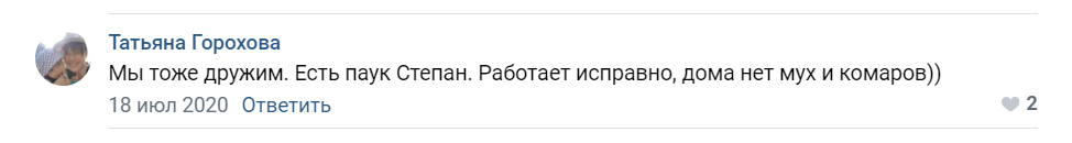 Но пауки мешают далеко не всем жильцам «Я — Романтика». Одни считают их своими домашними животными, другие пишут, что пауки уничтожают мошек, а третьи верят, что появление этих членистоногих — к деньгам.