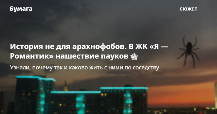 У ЖК «Я — Романтик» на намыве Васильевского острова есть специфическая особенность: каждое лето жители сообщают о нашествии пауков, а дома комплекса опутывает паутиной. Одни пытаются травить членистоногих, другие относятся к ним с симпатией и дают им имена, третьи ретируются и оставляют паукам свои лоджии.