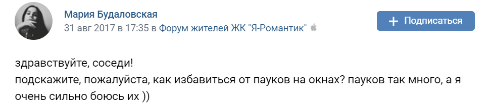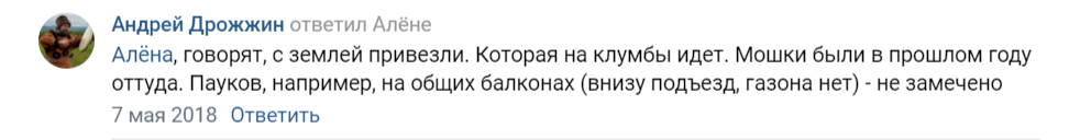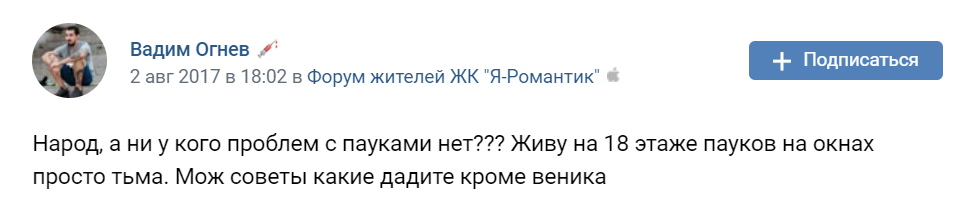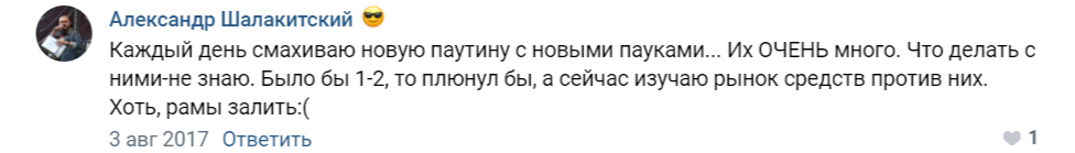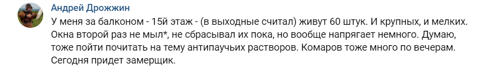 В независимой группе жильцов во «ВКонтакте» некоторые писали, что поначалу пауки их не беспокоили — сперва членистоногих было немного. Но в течение теплого сезона их количество увеличилось.