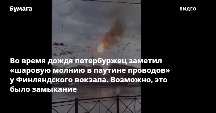В телеграм-канале «ДТП и ЧП» 29 июля опубликовали видео, снятое во время дождя у Финляндского вокзала. Как утверждает автор ролика, на нем запечатлена шаровая молния.