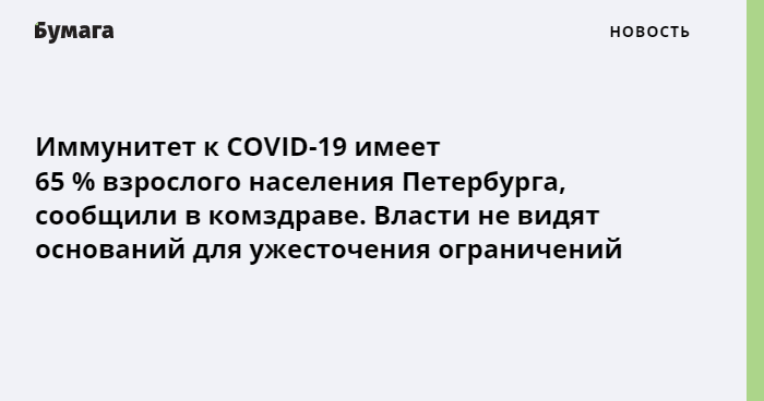 Иммунитет к COVID-19 в Петербурге по состоянию на 29 июля имеет 65 % взрослого населения. Об этом на пресс-конференции в ТАСС заявил председатель комитета по здравоохранению Дмитрий Лисовец.