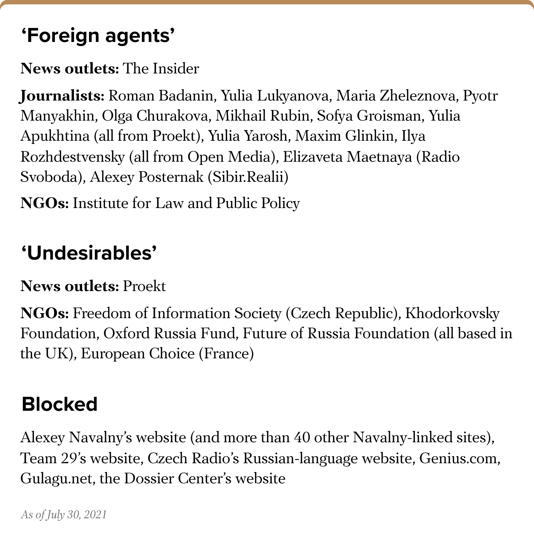 In July 2021, the Russian authorities designated the news outlet The Insider as a “foreign agent” and the investigative outlet Proekt as an “undesirable organization.” They also deemed the Russia-based Institute for Law and Public Policy a “foreign agent,” along with 13 journalists working for various publications. In addition, five foreign organizations were blacklisted as “undesirable” — four of which are associated with exiled former oil tycoon Mikhail Khodorkovsky. The authorities linked the fifth organization, the Prague-based Freedom of Information Society (Spolecnost Svobody Informace), to lawyers from the human rights association Team 29. As a result, Russia’s censorship agency blocked Team 29’s website, prompting the group to disband. Also in July, Roskomnadzor blocked Alexey Navalny’s website, along with more than 40 other sites linked to the jailed opposition politician. Russia also blocked Czech Radio’s Russian-language website (due to an article about the self-immolation of Czech student Jan Palach in 1969), as well as the song lyrics giant Genius.com (due to song lyrics recognized by Russian courts as extremist or encouraging suicide), and the website of the human rights project Gulagu.net, which suspended operations in Russia in May out of concern for the safety of its staff.