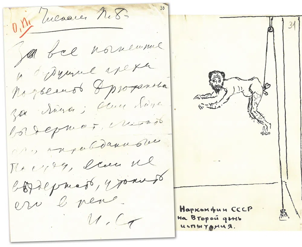 На заседании Политбюро ЦК ВКП(б) 5 апреля 1930-го гнев Сталина обрушился на наркома финансов Николая Брюханова, предложившего вместо серебра чеканить монеты из никелевого сплава. Сталин пишет записку членам Политбюро: «За все нынешние и будущие грехи подвесить Брюханова за яйца; если яйца выдержат, считать его оправданным по суду, если не выдержат, утопить его в реке». К сему кровожадному пожеланию Валерий Межлаук (зампред. ВСНХ) приложил картинку. Вот он — подвешенный нарком. Всем им пока смешно. Межлаука и Брюханова расстреляют в 1938-м. Своей судьбы они еще не знают, и на нудном заседании есть время отвлечься. А что? Один черкнул пару строк, другой шаржик набросал — весело.
