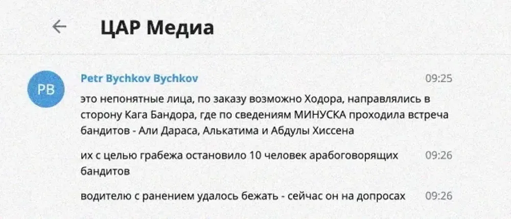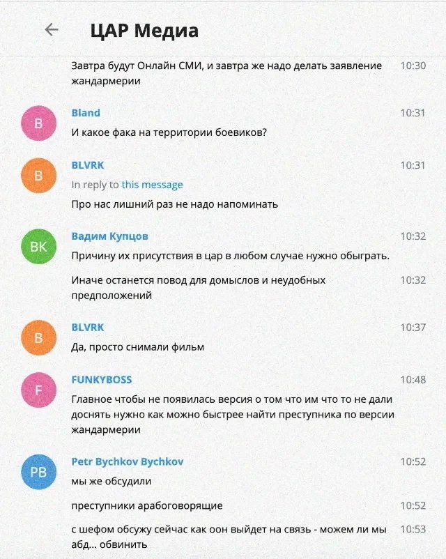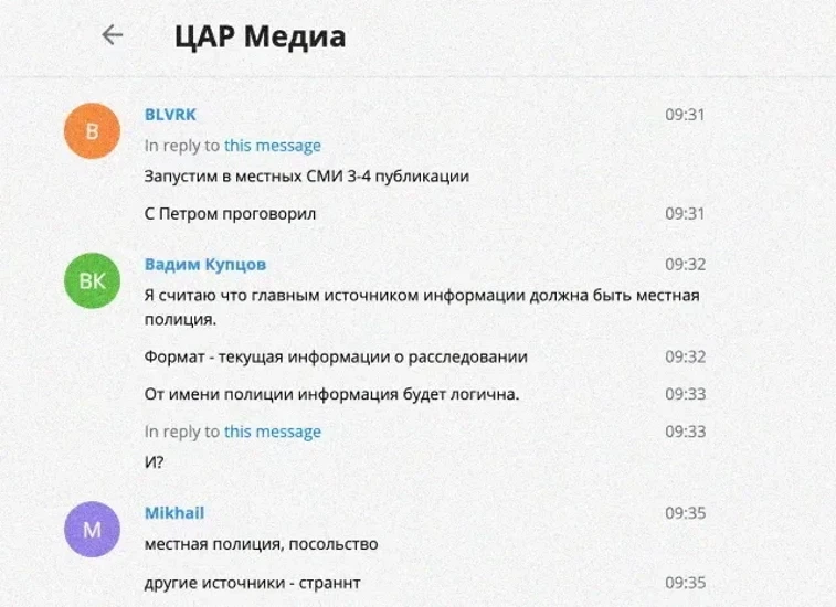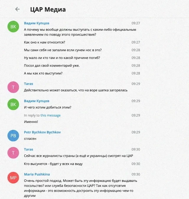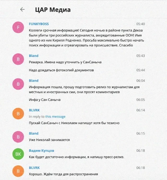Специалистам «Досье» также удалось получить доступ к внутренней переписке сотрудников «африканского проекта», связанного с Пригожиным, которая велась в мессенджере Telegram в групповом чате с названием «ЦАР Медиа». Переписка показывает, как после убийства журналистов пригожинцы начали планировать «версии» преступления, согласовывая их с Валерием Захаровым.