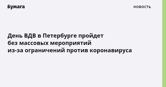 Власти Петербурга скорректировали план празднования Дня ВДВ из-за ситуации с коронавирусом. Об этом сообщает «Петербургский дневник» со ссылкой на пресс-службу комитета по печати, а также 78.ru со ссылкой на пресс-службу комитета по вопросам законности, правопорядка и безопасности.