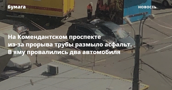 На парковке рядом с домом 33/1 по Комендантскому проспекту из-за прорыва трубы размыло асфальт. В образовавшуюся яму провалились два автомобиля, сообщают очевидцы в группе «ДТП и ЧП».