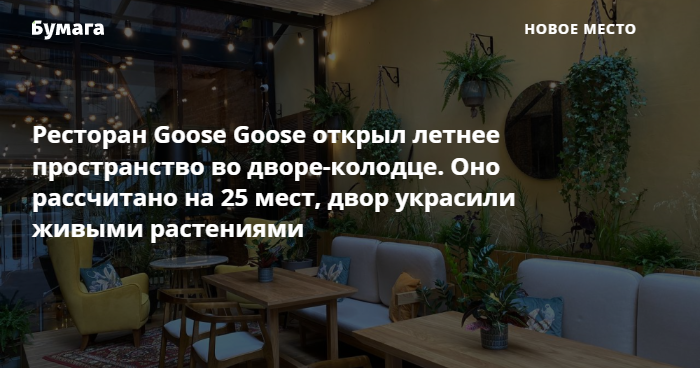 Goose Goose на Большой Конюшенной улице, 27 открыл летнее пространство во дворе-колодце при заведении, сообщили «Бумаге» представители ресторана. Раньше этот двор был закрыт, теперь из него сделали сад с верандой на 25 посадочных мест.