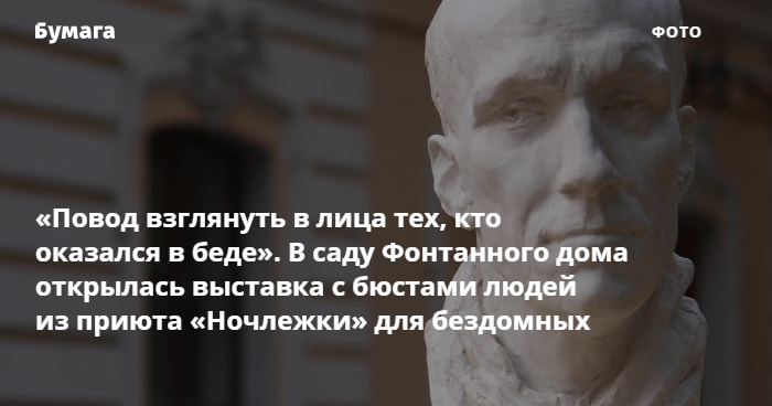 С 30 июля по 31 августа в саду Фонтанного дома, где находится музей Анны Ахматовой, можно посмотреть выставку «Без определенного места». На ней представлено девять скульптурных портретов людей из приюта «Ночлежки» для бездомных. К каждому из них прикреплена короткая заметка о герое.