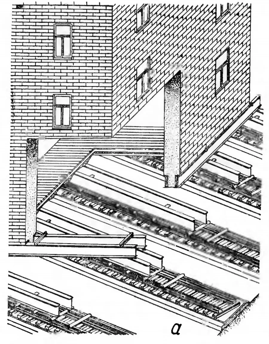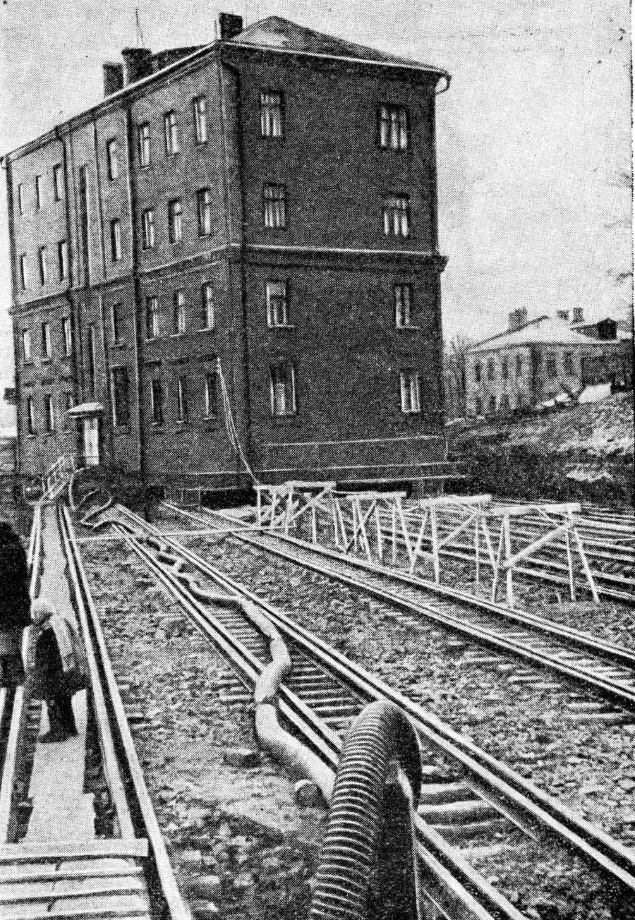 Технологии перемещения домов существовали самые разные. Разберем один способ, который «прижился» в ходе московской реновации, так, как его описал инженер-строитель Эммануил Гендель. Сначала здание буквально срезали с его фундамента, затем на уровне среза заводились опоясывающие весь дом рандбалки, которые как бы врезались в стены. Далее дом поднимали домкратами. После этого под рандбалками между домкратами до отметки дна котлована выламывали кладку фундамента, из-за чего под зданием образовывались широкие сквозные коридоры. В эти коридоры в направлении передвижки и укладывали рельсовые пути, на них катки и ходовые балки.