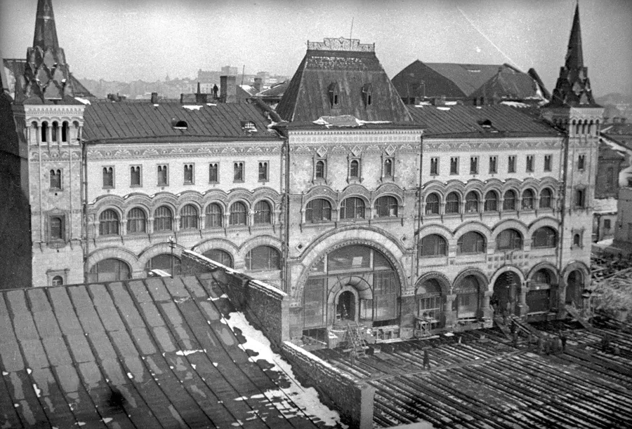 Советскому Союзу удалось переплюнуть Штаты — здание было успешно передвинуто. Сначала оно было срезано с фундамента на уровне подвала, что позволило сдвинуть его вместе с подвальными стенами и перекрытиями внутренних дворов, а под пути передвижки заложили основание из кирпичного щебня, уплотненного дорожным катком. Чтобы сдвинуть дом с места понадобилось в два раза больше усилий, чем при дальнейшей транспортировке, сдвижка здания с места производилась двумя электрическими лебедками, мощностью 15 тонн каждая. Ещё одной особенностью передвижки было отсутствие предварительного фундамента на новом месте, так как здание двигали вместе с подвалом и в зимний период, поэтому в апреле 1938 года было произведено нагнетание цементного раствора. Подворье перенесли за три дня. Техническая скорость движения при одной лебедке составляла 4-6 м/час , а при двух лебедках — 8-2 м/час .