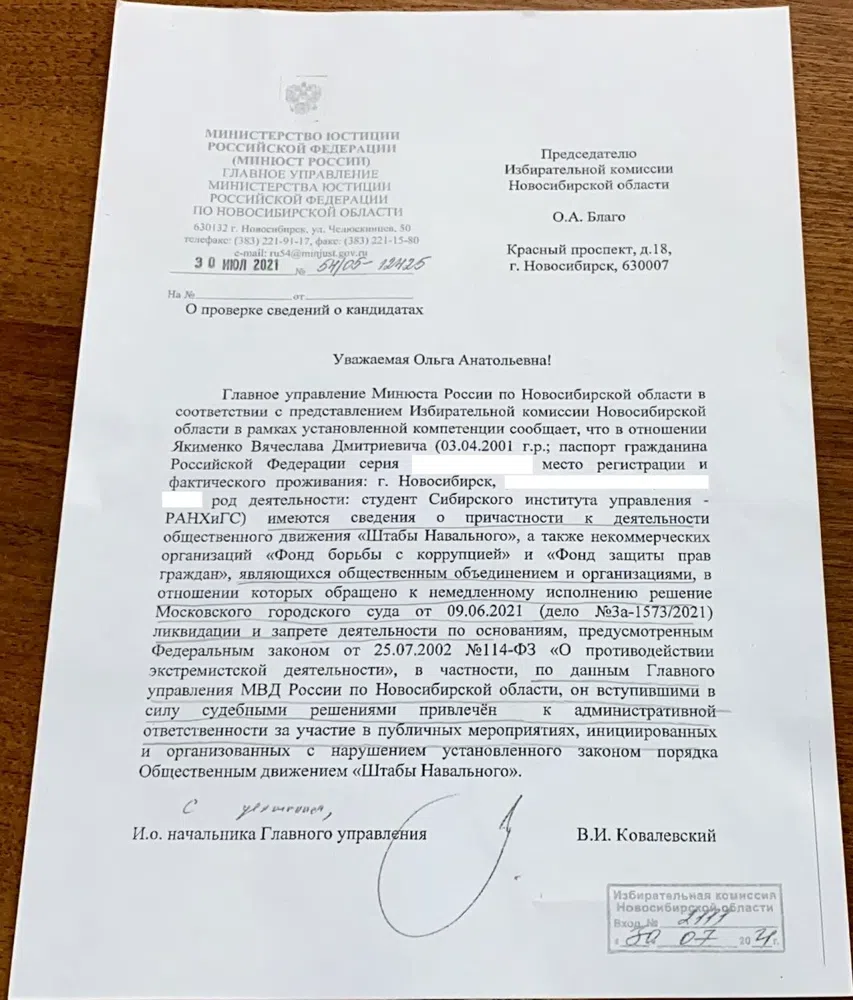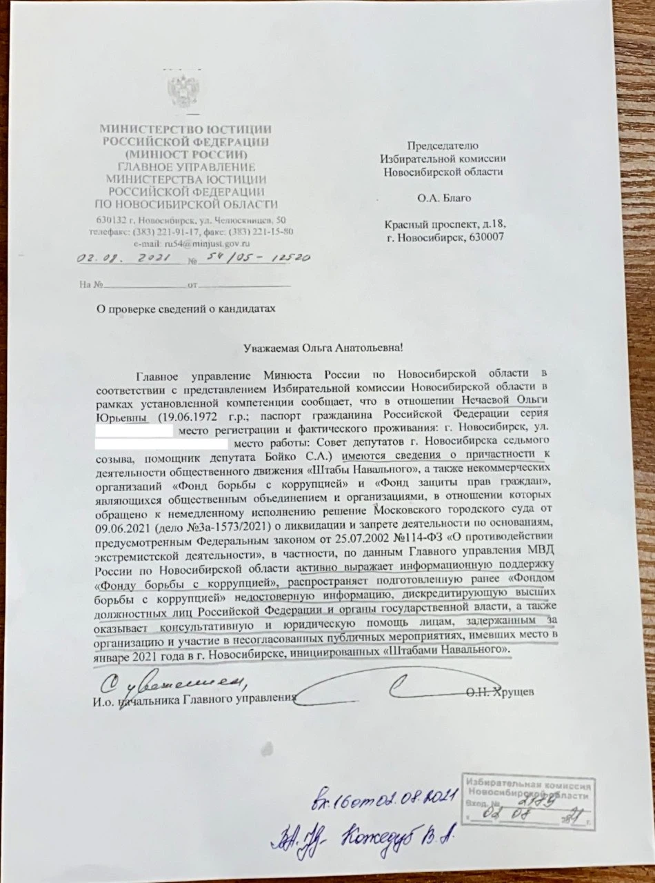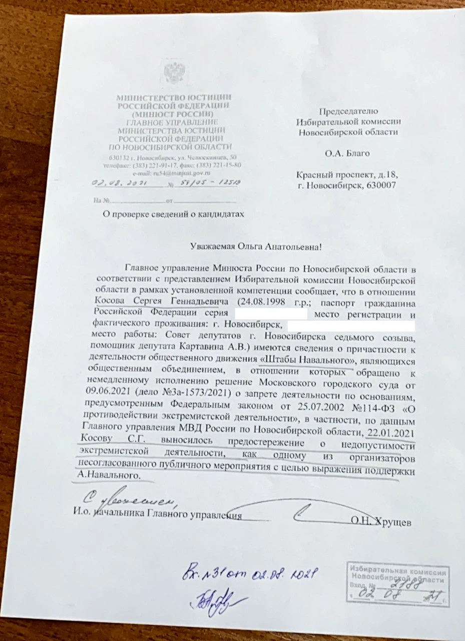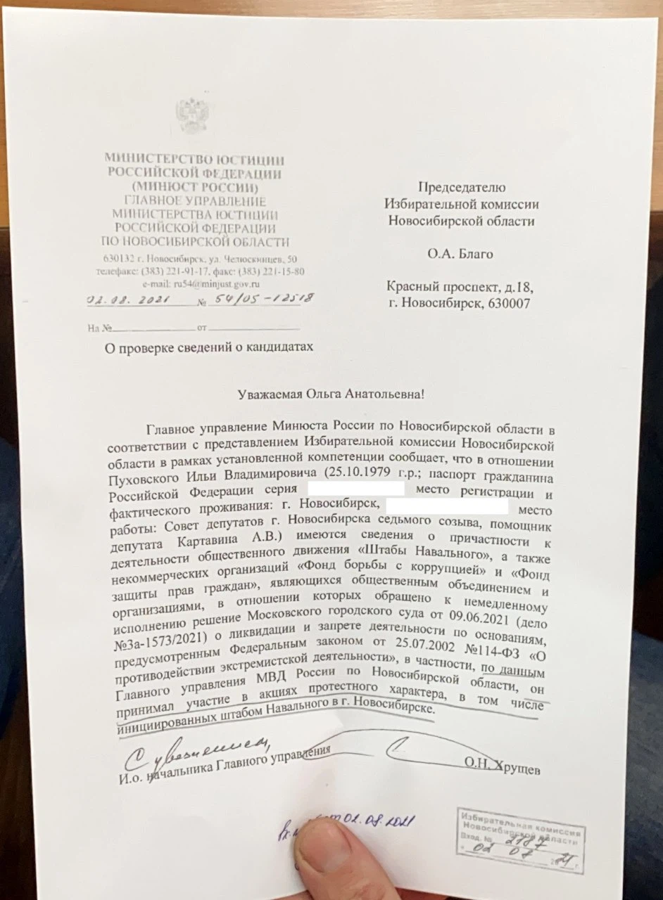 Избирательная комиссия Новосибирской области получила письма от Минюста в рамках проверки сведений о кандидатах. По версии министерства, кандидаты причастны к деятельности штабов Навального*: Илья Пуховский якобы посещал январский митинг Навального, Сергею Косову вынесли предупреждение как одному из его организаторов, Вячеслава Якименко арестовали за организацию, а Ольга Нечаева помогала задержанным. Ранее горизбирком Бердска отказался регистрировать кандидата Кирилла Левченко также из-за связи со структурами Навального.