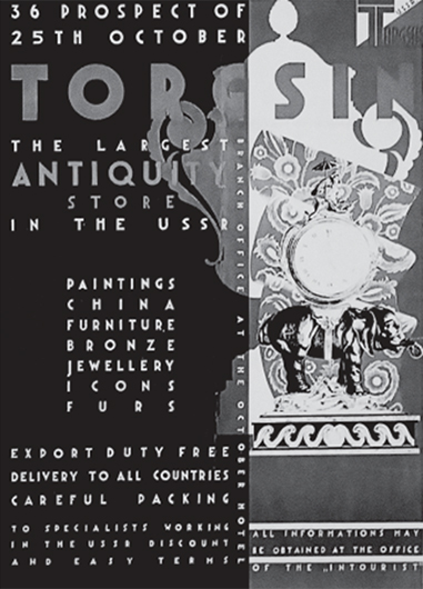 © Собрание Говарда Гарфинкеля, Братенхол, Огайо Неизвестный художник. Проспект 25 Октября, 36. Торгсин. Крупнейший антикварный магазин в СССР. Живопись, фарфор, мебель, бронза, ювелирные изделия, иконы, меха. Плакат Однако нужды в деньгах они не испытывали и вложением средств озабочены не были. Поэтому с упоением начали коллекционировать. Как признавался впоследствии господин посол, собирательство сделалось для них своего рода «болезнью», а советские власти создали для их увлечения исключительно благоприятные условия. Неудивительно, что Дэвисы буквально «заболели» Россией. Дворцы, музеи, поездки в Ленинград, посещение Эрмитажа, регулярные походы по антикварным и комиссионным магазинам казались им захватывающими. Не подозревавшие, что до них в Москве и Ленинграде изрядно потрудились Хаммер, Сноумен и Шаффер, вывозившие в конце 1920-х годов антиквариат чуть ли не вагонами, Дэвисы чувствовали себя первооткрывателями. Тем более что благодаря неиссякаемым госфондовским запасам даже на исходе 1930-х годов магазины не пустовали. Так что покупатели с деньгами прекрасно могли найти для себя интересное среди «сваленной тоскливыми кучами» серебряной и золоченой посуды, люстр и подсвечников, мебели и ковров, поражавших воображение иностранцев, а особенно американцев, отказывавшихся верить, «что в мире существует <…> столько миль хорошей живописи, такие горы малахита, агата и лазурита».