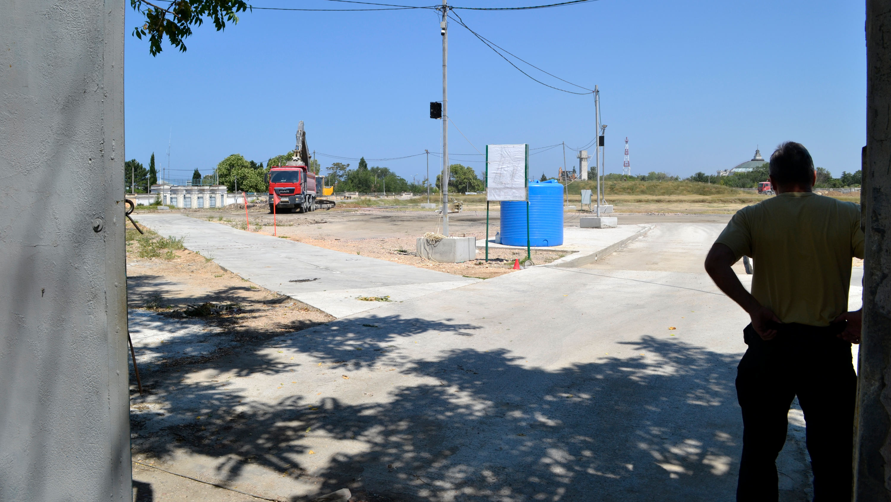 Через ворота бокового выхода видны работы, которые сейчас там проводят. Реконструкция началась год назад. Обещают, что здесь будет не только легкоатлетический стадион, но и ледовая арена. Также военное начальство утверждает, что забор вокруг сооружения будет из стеклянных панелей, оставят только колонны входной группы.