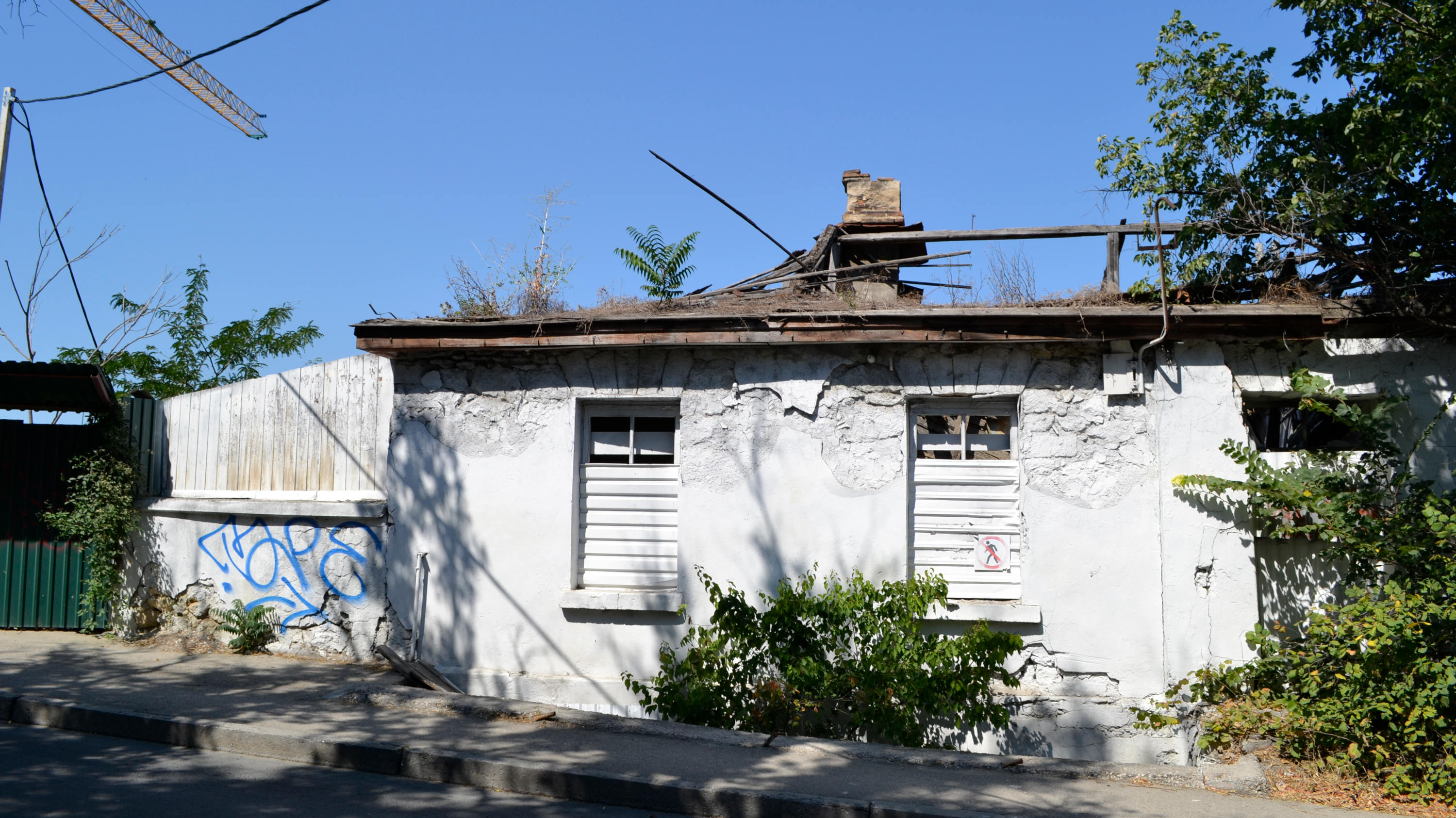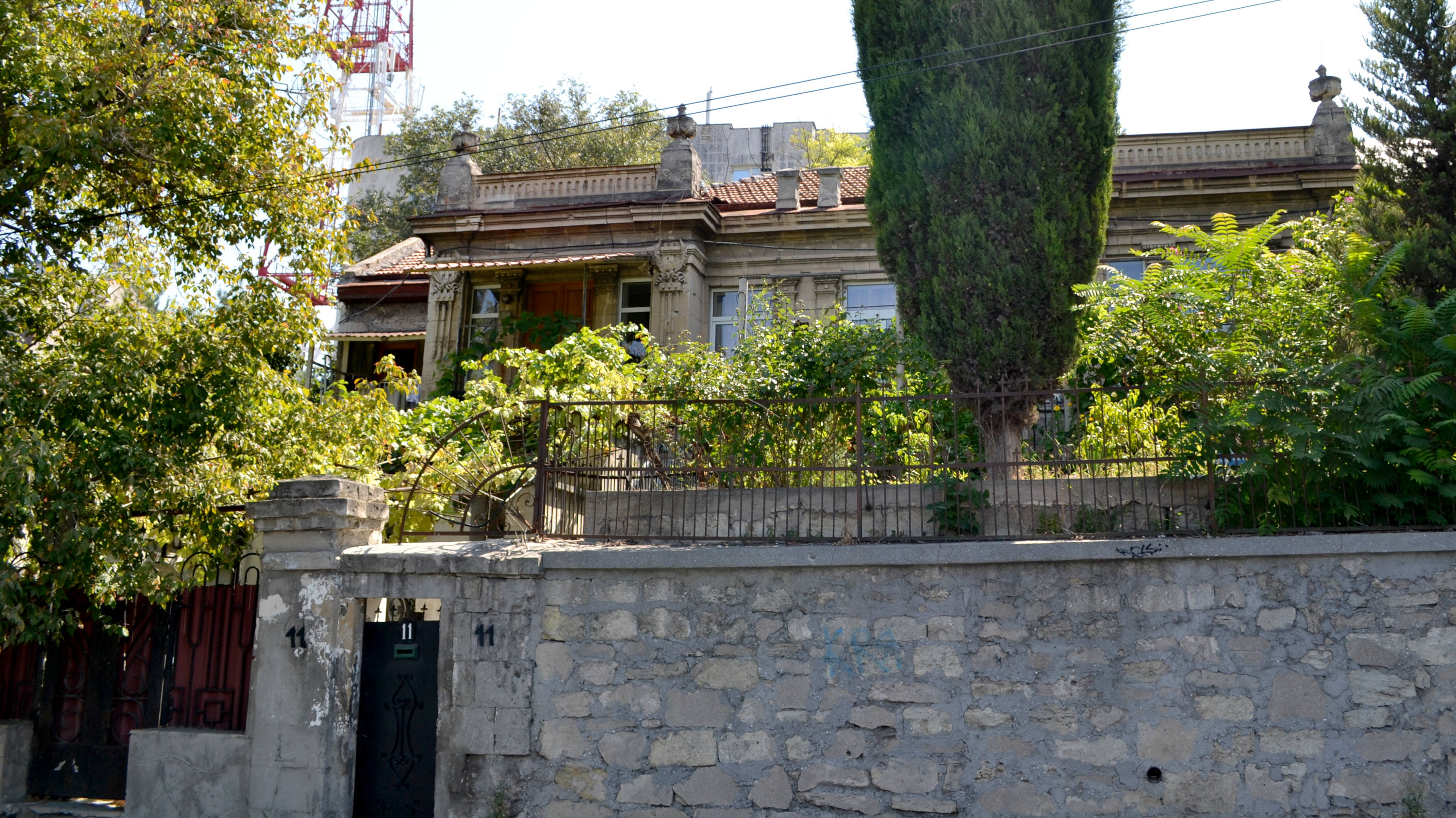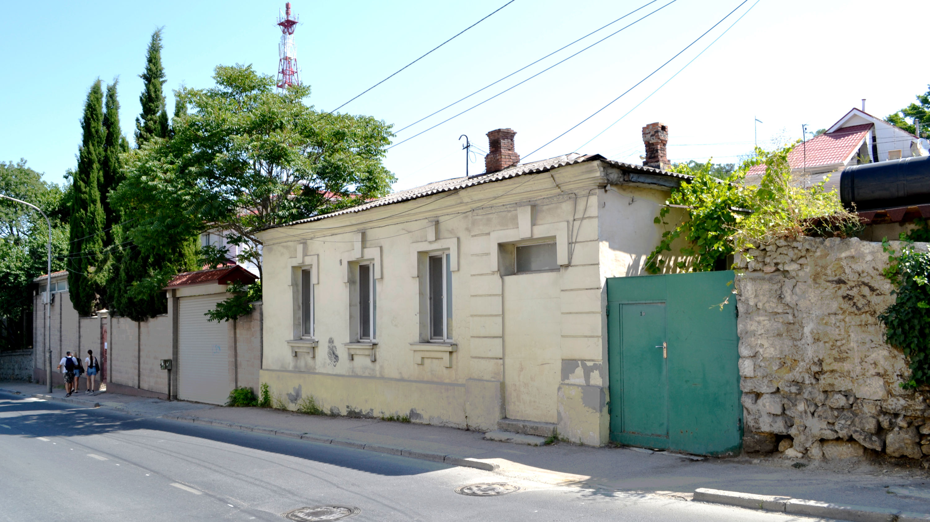 А на четной стороне первый частный дом, под №14, появляется ближе к середине подъема. Его сосед – заброшенный дом №16 – знаком нам по публикации «Пустые глазницы домов Севастополя». Недавно окна и двери в нем заколотили, а также зачем-то побелили снаружи. Над домом нависает стрела башенного крана – ниже, на улице Гоголя, многоэтажку строит еще с украинских времен небезызвестная «Консоль», входящая, как это сейчас принято говорить, «в орбиту влияния» спикера российского парламента Крыма Владимира Константинова.