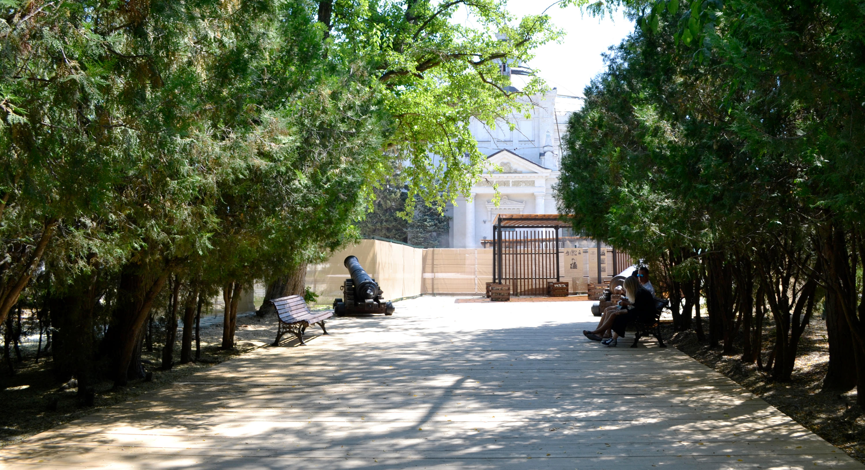 Улица 4-я Бастионная, поднявшись на самый верх Бульварной высоты, далее выходит на небольшую площадь, где расположен вход на Исторический бульвар. Бульвар, как известно, три года кряду стоит в разрухе начавшейся реконструкции. Контракт с предыдущим подрядчиком расторгнут, взаимоотношения перешли в плоскость уголовных разбирательств, российский губернатор города Михаил Развожаев прошлой осенью заявлял, что проект переделают. А входную аллею в этом сезоне замостили досками, чтобы туристы ноги не ломали.