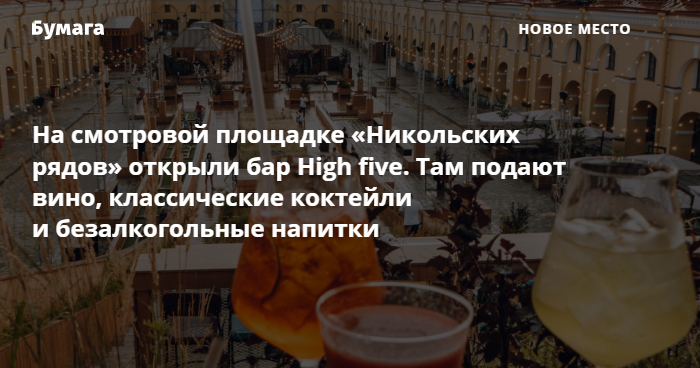 На территории «Никольских рядов» открыли винный бар High five, рассказали «Бумаге» представители общественного пространства. Заведение находится на смотровой площадке комплекса, откуда открывается вид на внутренний двор.