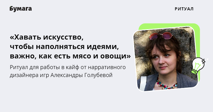 Как поддерживать постоянный уровень креатива, если новые идеи — твоя работа? Творческий процесс можно стимулировать переключением между задачами и сложным и качественным искусством, считает нарративный дизайнер игр Александра Голубева, также известная как Альфина — новая героиня нашей рассылки «Когда работа в кайф».