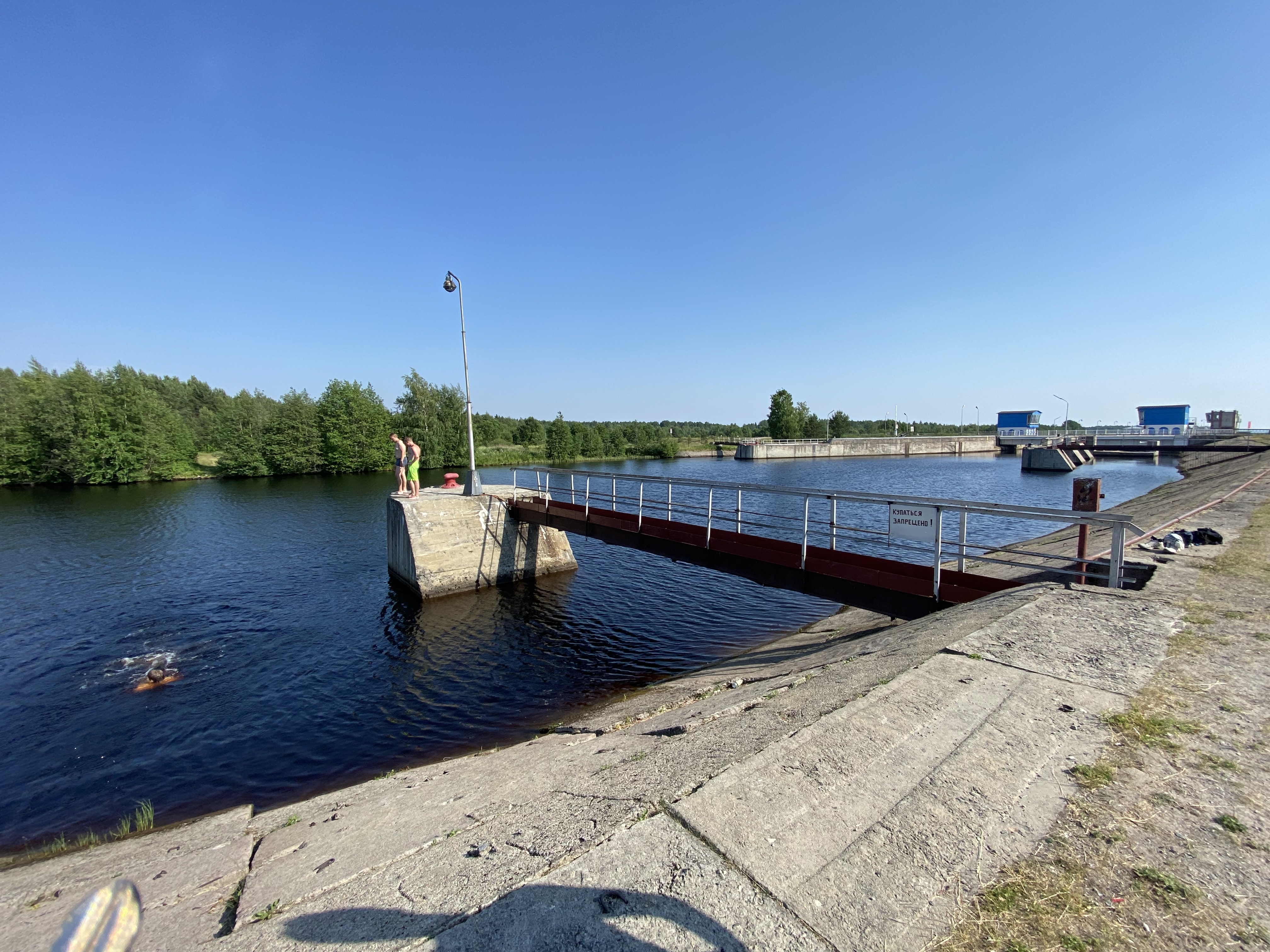 Между вторым и третьим шлюзами в разливе ББК, аккурат у таблички "Купание запрещено", купаются местные подростки: прыгают в канал с бетонной платформы, прямо над которой висит нечто напоминающее камеру наблюдения. Чуть поодаль, на импровизированном пляже с такой же табличкой, но без камеры, загорают и купаются местные жители старшего поколения.