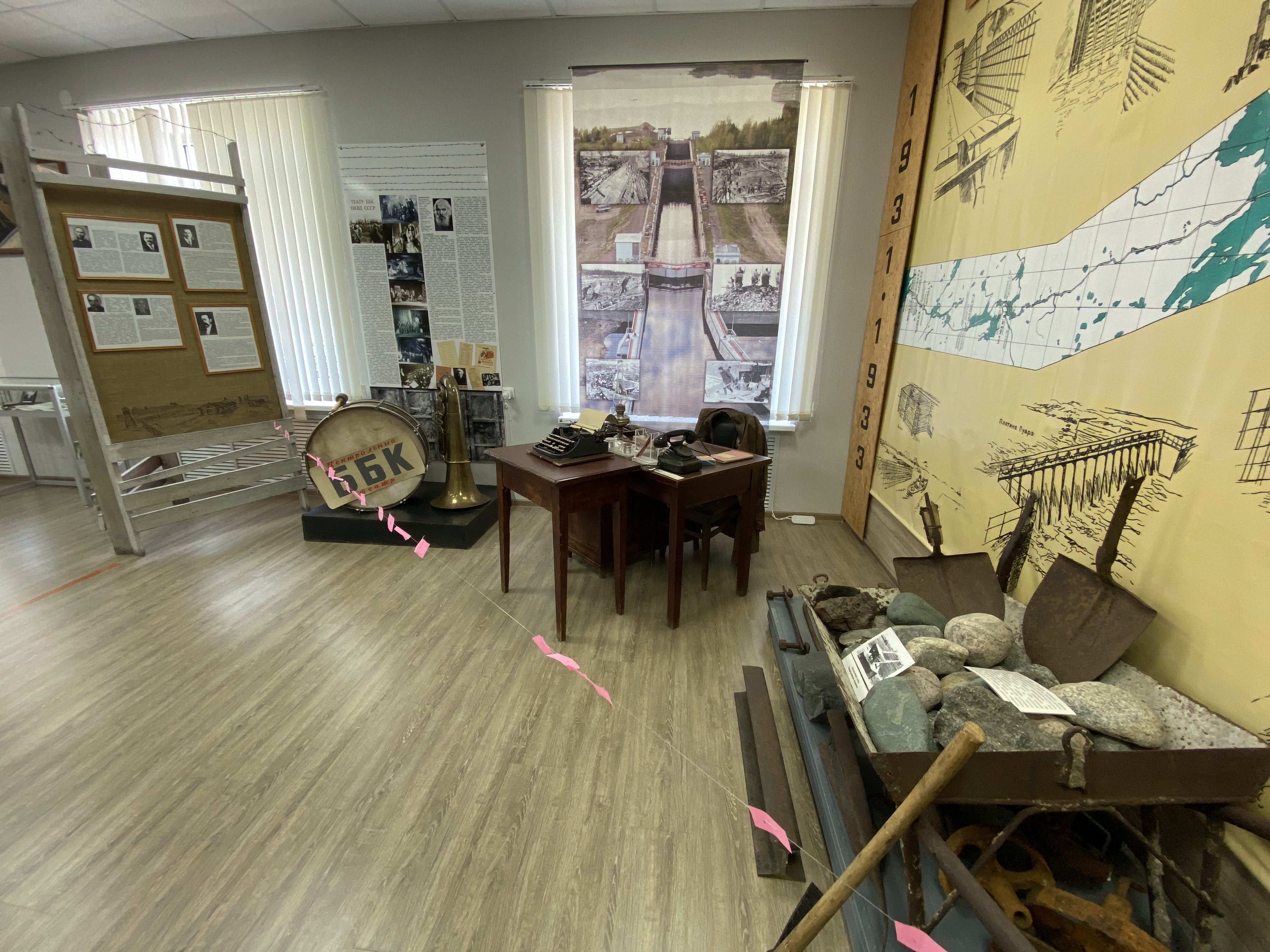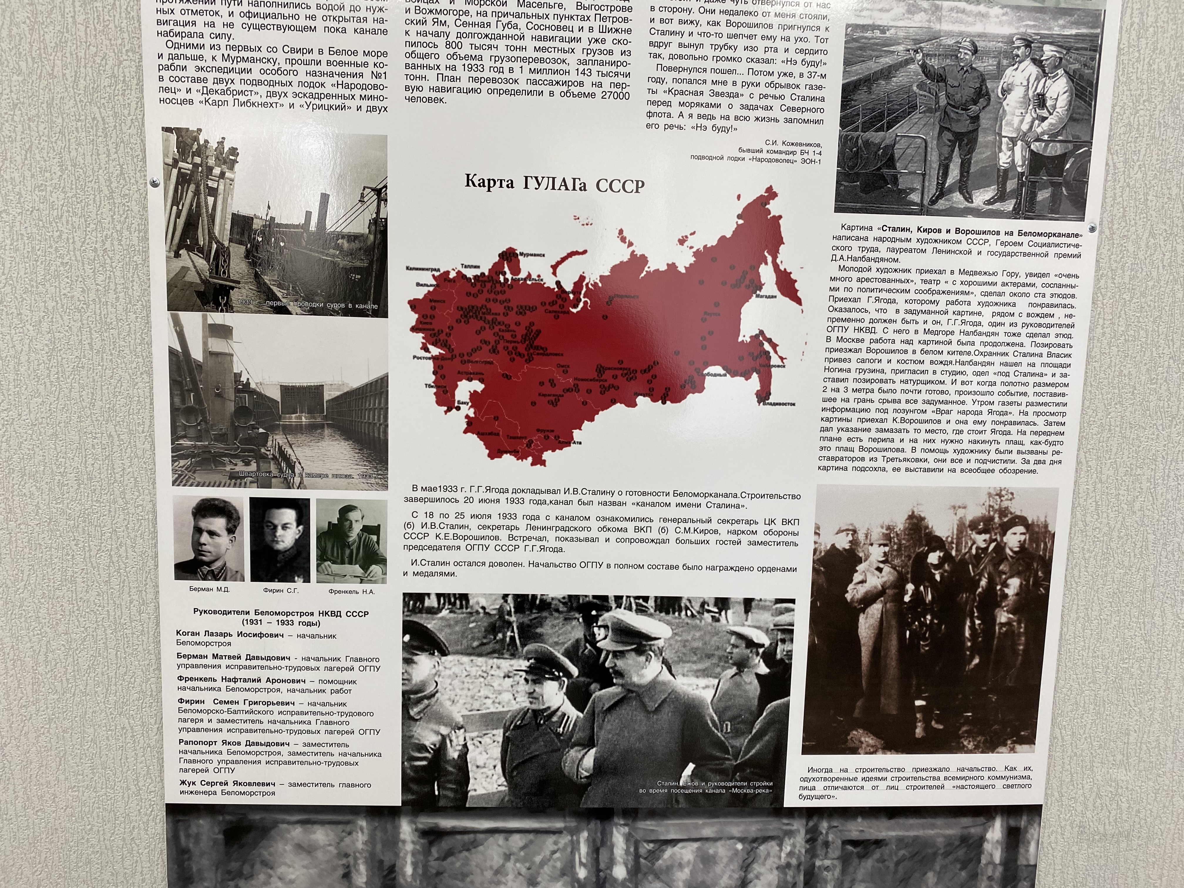 В музее под ББК выделен один из четырех залов и часть коридора. Тут на первом плане не преступления режима и человеческие судьбы, а грандиозность инженерной мысли. Карта ГУЛАГа на стене – лишь факт истории, а фотографии руководителей стройки – иллюстрация вынужденного приспособления к неизбежному.