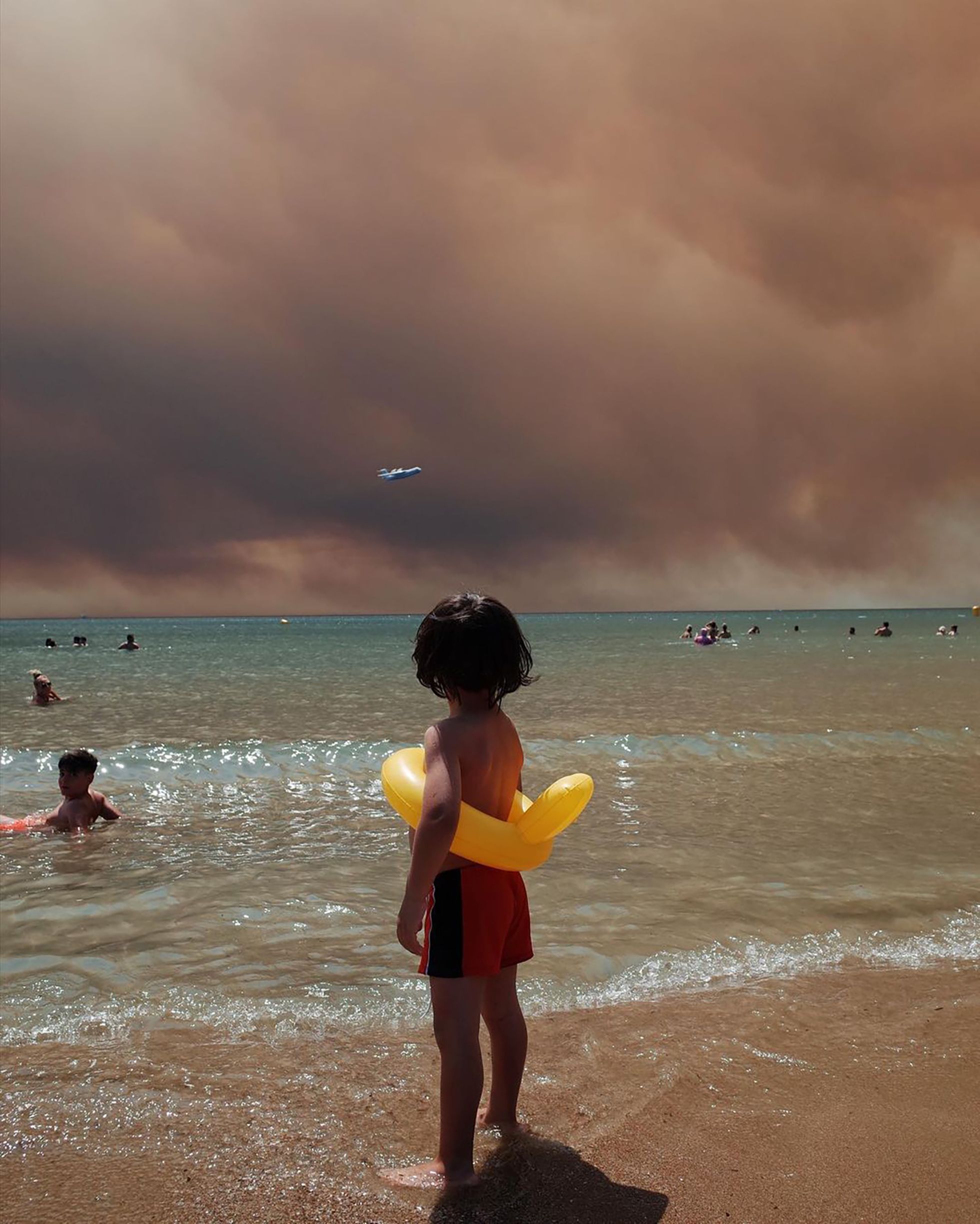 Фотография мальчика, забывшего о купании при виде пожарного самолета на фоне затянутого дымом неба над пляжем, набрала в инстаграме фотографа почти 25 тысяч лайков, а обстоятельствами создания снимка заинтересовались мировые СМИ. Экоактивисты и журналисты, в том числе Дэвид Уоллес-Уэллс, автор книги «Необитаемая Земля. Жизнь после глобального потепления», назвали ее яркой иллюстрацией последствий изменения климата (впрочем, среди многих других изображений ежегодных пожаров и без особенных на то научных оснований).