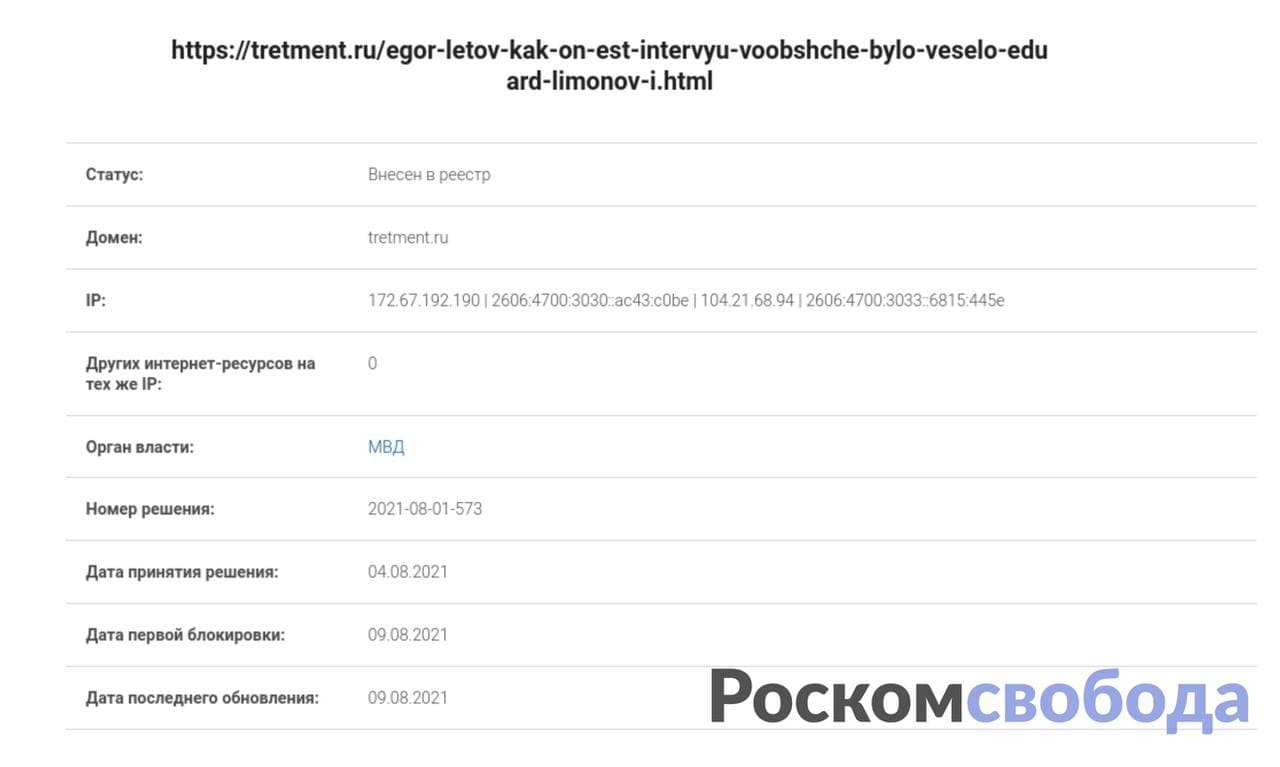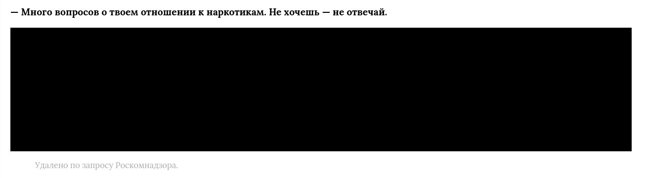 Проводя мониторинг реестра заблокированных сайтов, мы обнаружили там ссылку на интервью «Егор Летов как он есть», где лидер группы «Гражданская оборона» откровенно отвечает на вопросы журналистки Любови Парфентьевой, в том числе — на тему наркотиков: