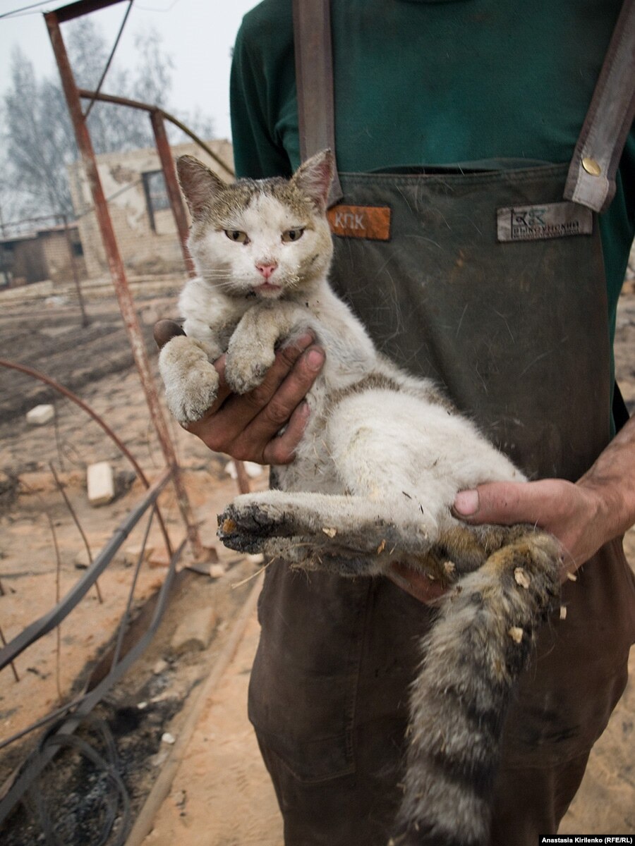 "Животных погибших много, кролики, курицы, кошки, собаки на цепях. Есть и те, кого успели хозяева спасти, самовыгульные или снятые с цепей. Мы хотели их забрать в город, но местные попросили не забирать, будут присматривать за собаками, кормить их, пока хозяева не вернутся… Кошек на пепелище нашли пять и котенка. Четыре пострадали сильно, одна киса не пострадала, она у меня в ванной сейчас, у всех кошек естественно стресс после огня", – рассказала Сычева.