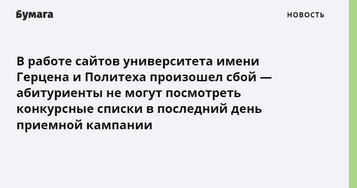 О проблемах с доступом к сайту РГПУ имени Герцена сообщили читатели «Бумаги», об этом также пишут в комментариях в группе университета. В частности, были недоступны конкурсные списки, возможность подать и отозвать документы. Студенты пишут, что такая же ситуация в последний день приемной кампании возникла и в прошлом году. В вузе пока не комментировали ситуацию, но на сайте говорится, что в случае возникновения технических проблем абитуриенты могут подать заявление по электронной почте.
