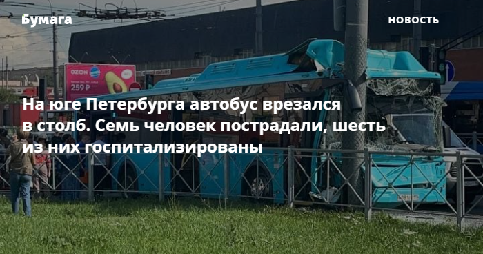 На юге Петербурга автобус врезался в столб. Семь человек пострадали, шесть из них госпитализированы