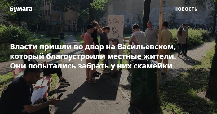 Ранним утром 11 августа во двор дома № 35 на 10-й линии Васильевского острова пришли сотрудники СПХ «Василеостровец» — садово-паркового предприятия, подведомственного комитету по благоустройству. Они хотели увезти деревянные скамейки, которые в июле там своими силами установили местные жители. Об этом «Бумаге» рассказал Никита Комаров — он занимался благоустройством двора.