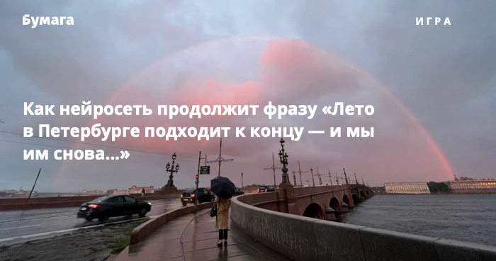 «Лето в Петербурге подходит к концу — и мы им снова…» Мы посмотрели, как «Балабоба» — нейросеть «Яндекса», которая генерирует тексты, — продолжит эту фразу. Получился абсурдный и в то же время пронзительный текст. Ради смеха мы превратили его в тест с пропусками слов: попробуйте догадаться, что хотела сказать нейросеть, кликая по пропускам, и затем — по словам, которые хотите подставить.