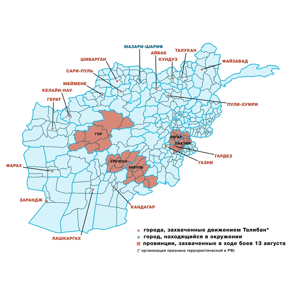 С 12 августа, после падения древней столицы Газни, события в Афганистане приняли обвальный характер, начался развал системы обороны правительственных войск. За двое суток «Талибан» с союзниками из «Аль-Каиды» и ИГИЛа (все три организации признаны в России террористическими и запрещены) захватили крупнейший город на западе страны Герат (губернатор Исмаил-Хан, в прошлом — один из лидеров антисоветского джихада, сдал город без боя), после непродолжительного сопротивления пал Кандагар, имеющий неофициальный титул второй столицы. Захвачена провинция Бадгис с центром Калайи-Нау, Лашкаргах сдан после недельных боев.