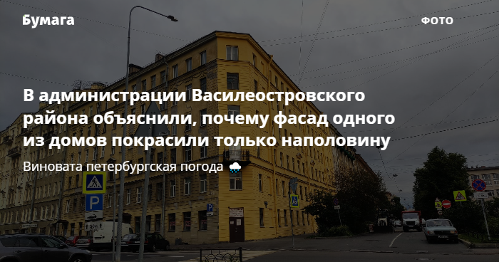 Фасад жилого дома на Опочининой улице покрасили только наполовину из-за «неблагоприятных погодных условий». Об этом «Бумаге» сообщили в администрации Василеостровского района со ссылкой на ЖКС № 1 — управляющую компанию здания.
