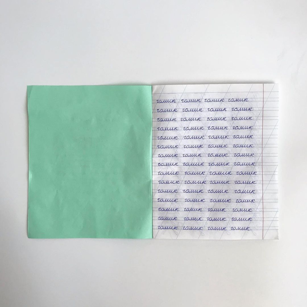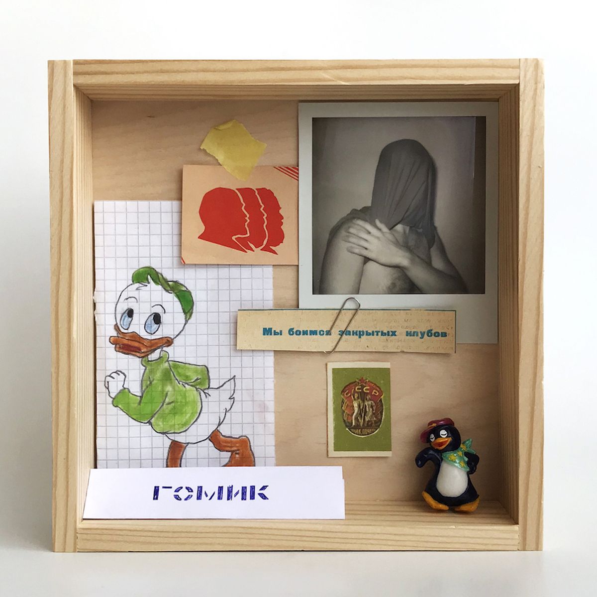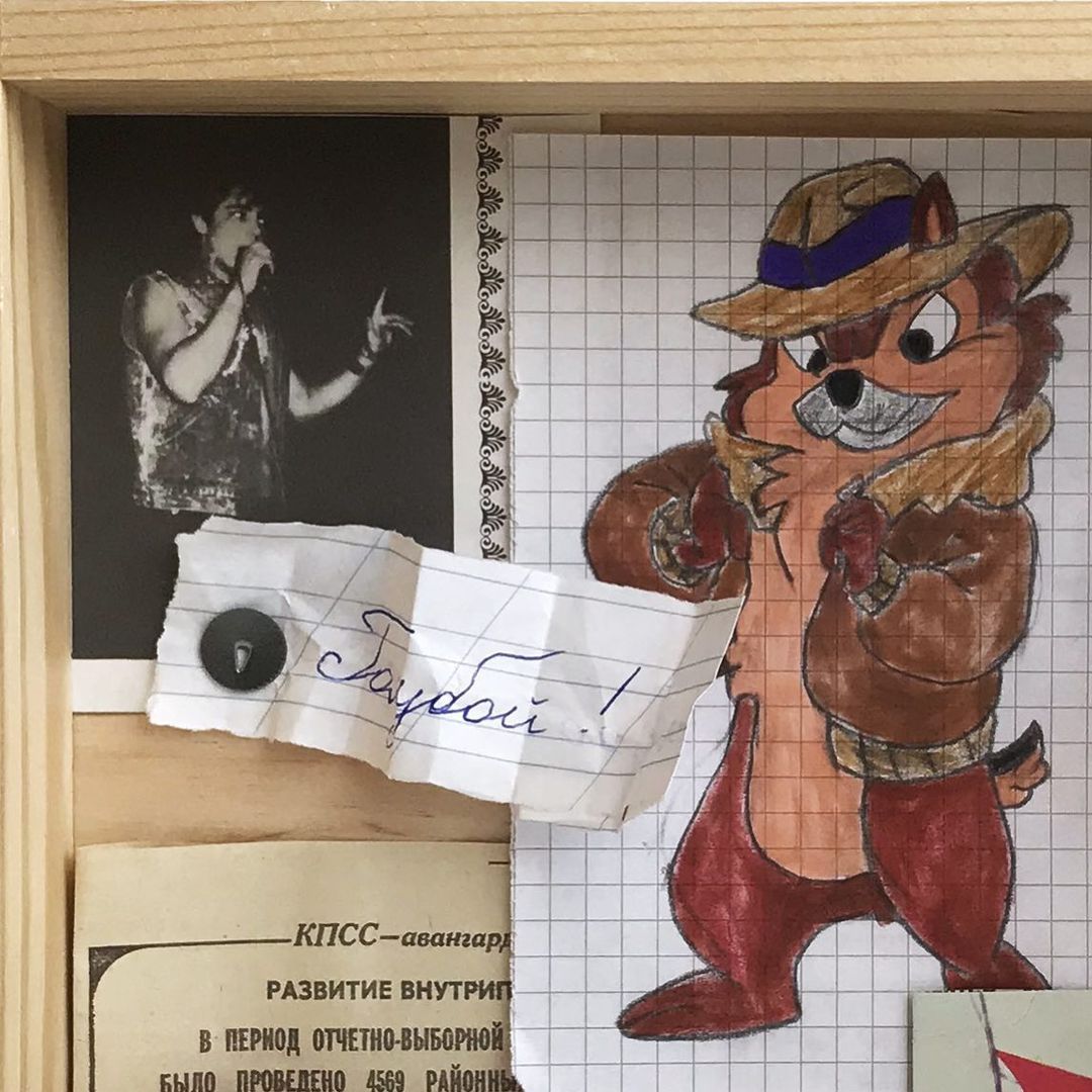 In preparation for the PASHA art project, the artist started gathering archival materials from when he was growing up to create “memory boxes” made up of “trinkets from childhood, clippings from newspaper and magazines from the 1980s.” These “snapshots” of the Soviet Union’s later years became a key components of the project. “For example, one of the works has a portrait of [Soviet leader Leonid] Brezhnev, under whom I was born,” the artist explains to Meduza. “These ‘boxes’ are mixed [with] what is happening with me now. There are photographs of me now and what happened when I was little. Somethings I recreated — for example, drawings I drew in school on the backs of lined notebooks. Or the notes that we passed to each other in school.”