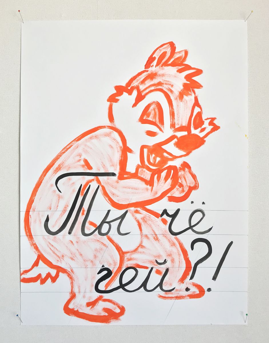 At the same time, the artist underscores that the use of homophobic slurs in his works isn’t an attempt to rid these insults of their negative connotations or “reclaim” them for himself. “For me [‘fag’] always was and will remain an insult. I experienced very negative emotions when called that. And I don’t think I will ever be able to call myself that,” he tells Meduza.