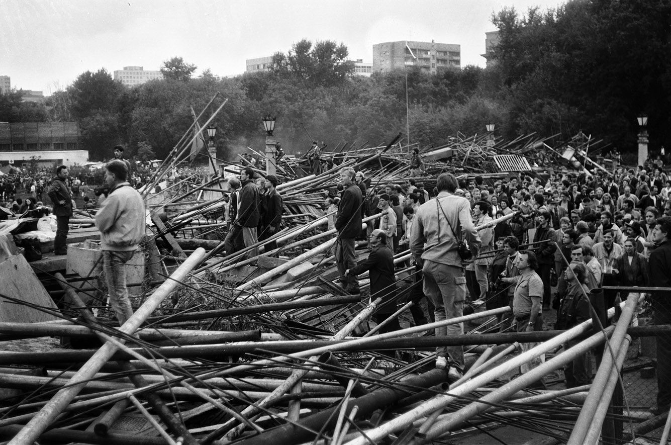 One of the very first barricades that was built on the evening of August 19. The objective was to block the path to the White House for the tanks. When we were standing at the White House we saw people who were in Afghanistan, they were 26 to 28 years old — people with combat experience. There was the thought that if they seriously attacked us, we would be swept away no matter what. And if we start shooting back, blood would be shed and we would be killed. But if we stand without weapons — just on the understanding of our own righteousness, — our position is stronger. We are citizens of this country, we’re the majority, and we think it should be so.