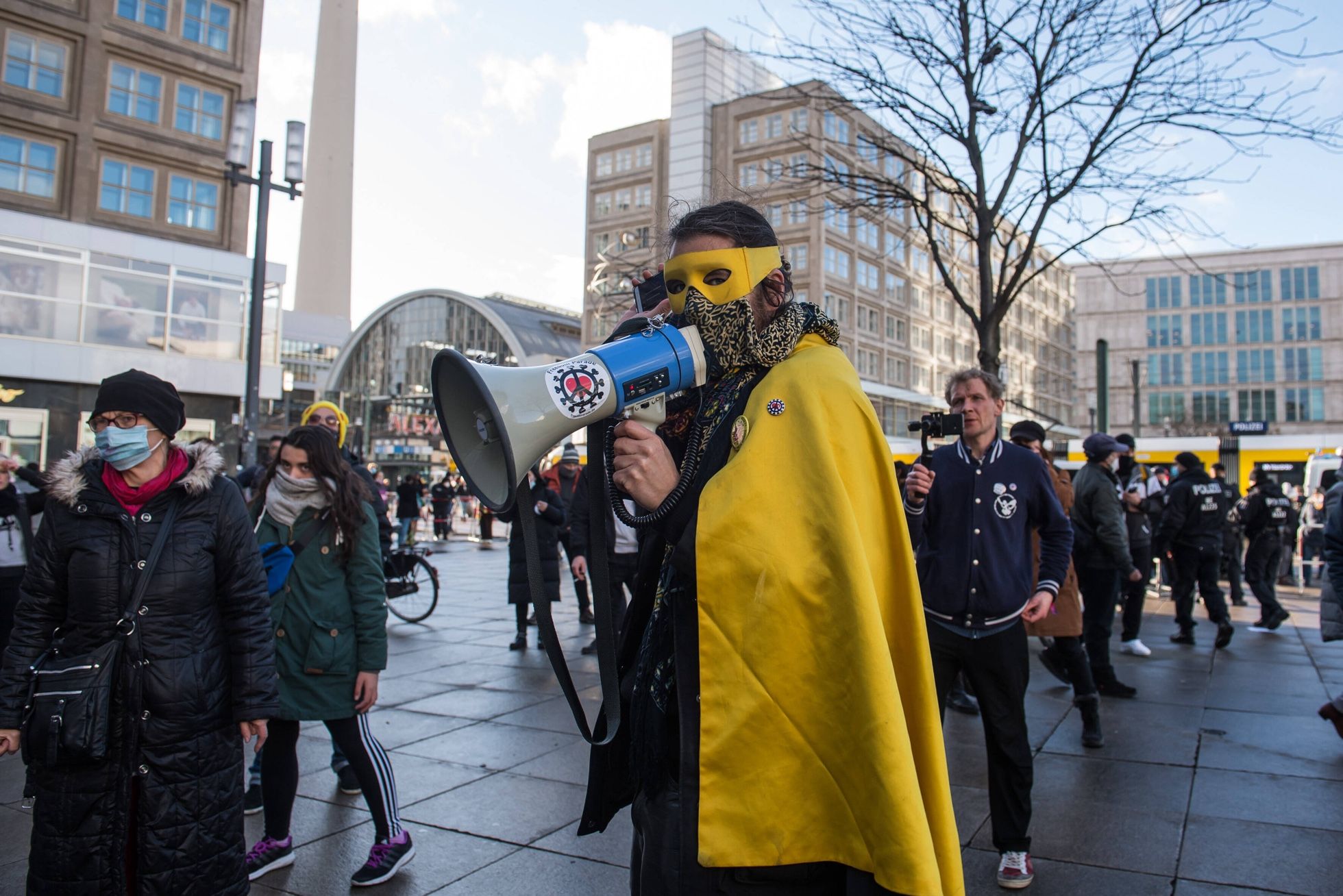 Первые акции ковид-диссидентов в Берлине прошли еще в марте 2020-го на площади Розы Люксембург. Они сразу же образовали канон таких собраний, который практически без изменений продержался следующие полтора года (на пике акции собирали до 100 тысяч человек).