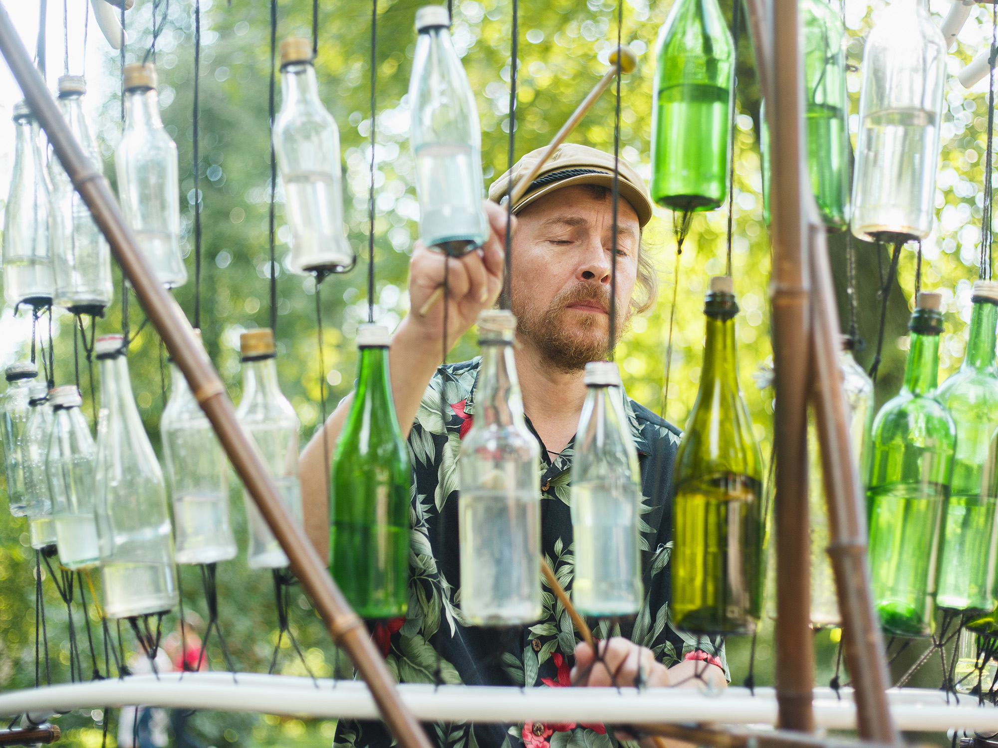 Мужчина в кепи и рубашке с красными цветами играет на необычном инструменте — бутылофоне. К конструкции из бамбуковых трубок и шланга подвешены стеклянные бутылки — из-под вина, сока, соевого соуса. Музыкант ударяет по ним деревянными палочками и покачивается в такт. У каждой емкости свое звучание, которое усиливает налитая в нее вода.