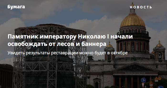 Памятник императору Николаю I на Исаакиевской площади начали реставрировать в 2018 году. Тогда вокруг него установили строительные леса, которые обтянули баннером. Восстановительные работы планировали закончить к 2022 году.