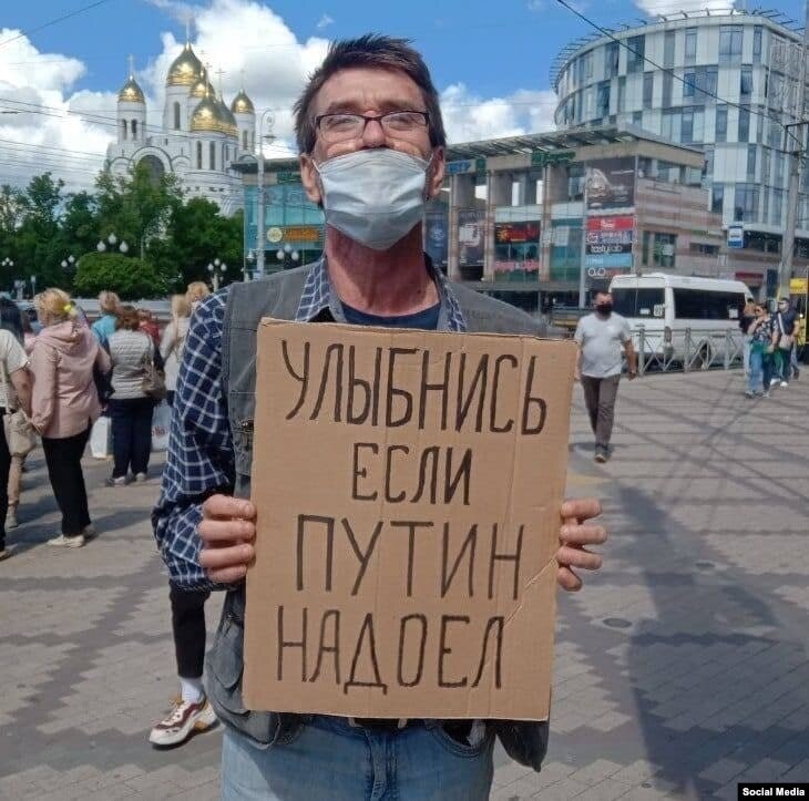 Он связывает возбуждение дела с другими одиночными пикетами, на которые он выходит с плакатом "Улыбнись, если Путин надоел".