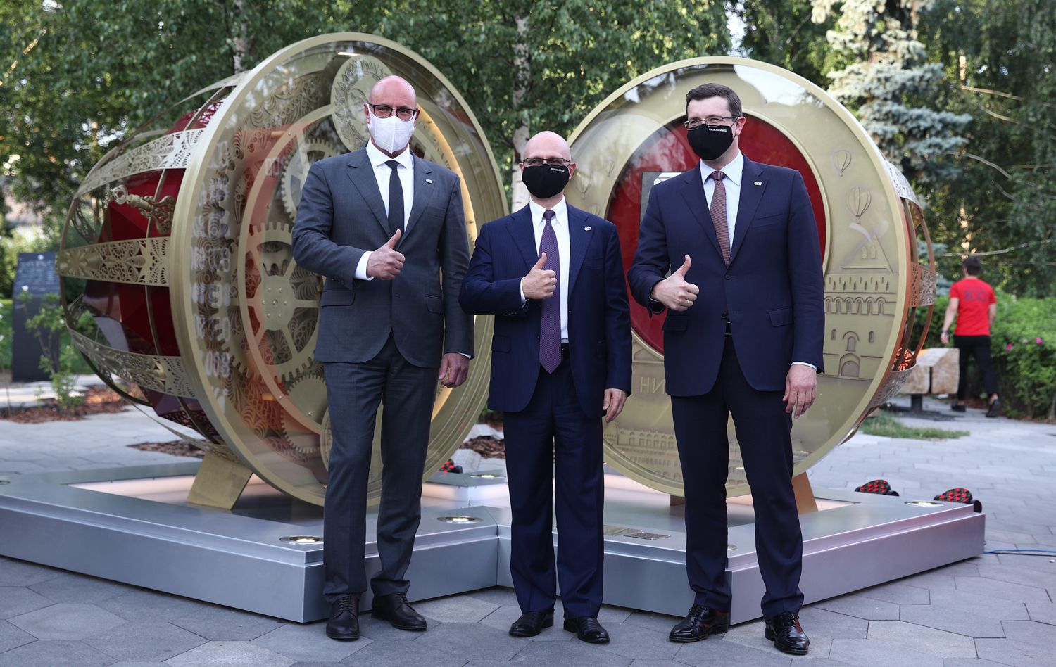 Сергей Бобылев / ТАСС Вице-премьер Дмитрий Чернышенко, первый заместитель руководителя Администрации президента Сергей Кириенко и губернатор Нижегородской области Глеб Никитин (слева направо) во время церемонии открытия часов обратного отсчета до 800-летнего юбилея Нижнего Новгорода. 21 июня 2021