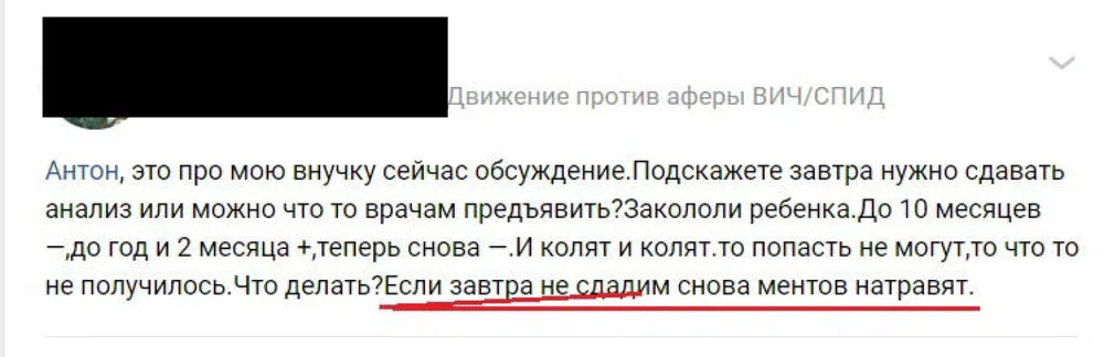 «Беременные женщины, отрицающие существование ВИЧ, отказываются от проведения химиопрофилактики передачи ВИЧ-инфекции, и после рождения ребенка уклоняются от обследования и лечения ВИЧ-инфекции, что ведет к увеличению числа детей с ВИЧ-инфекцией и повышению смертности среди них», — отмечал Минздрав.